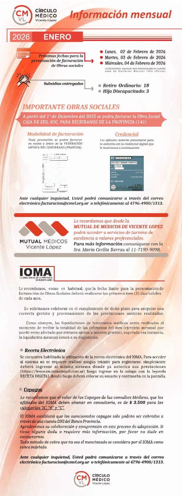 30 Ene Circular de conocimiento obligatorio para Socios y Prestadores Publicado a las 14:12hs. en Administración, Informes por Círculo Médico Vicente López Compartir Click en la imagen Para solicitar información comuníquese con nosotros a los teléfonos 4796-1313 / 4796-1900, o al E-mail facturacion@cmvl.org.ar Etiquetas: Circular, Obligatorio, Prestador, Socio